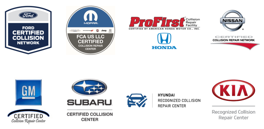 + We repair all makes and models and have received OEM-Certified recognition from GM (Chevy/Buick/Cadillac/GMC), Ford + Ford Aluminum, FCA (Chrysler/Dodge/Jeep/Ram/Fiat), Honda, Acura, Subaru, Nissan, Kia & Hyundai.